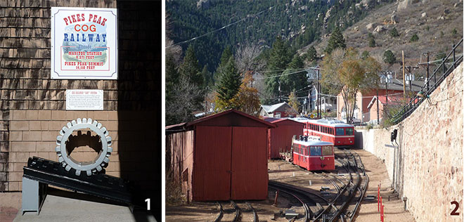 マニトウスプリングスにある山麓駅ではラックレイルの説明(写真1)にアブト式の説明があるが「正しくはシュトループ式」などと野暮なことは言わないでおこう。駅から望む車庫の脇を山頂からの列車(写真2)が下ってきた。車体の側面には歯車のエンブレム(写真3)が誇らし気に掲げられていた。