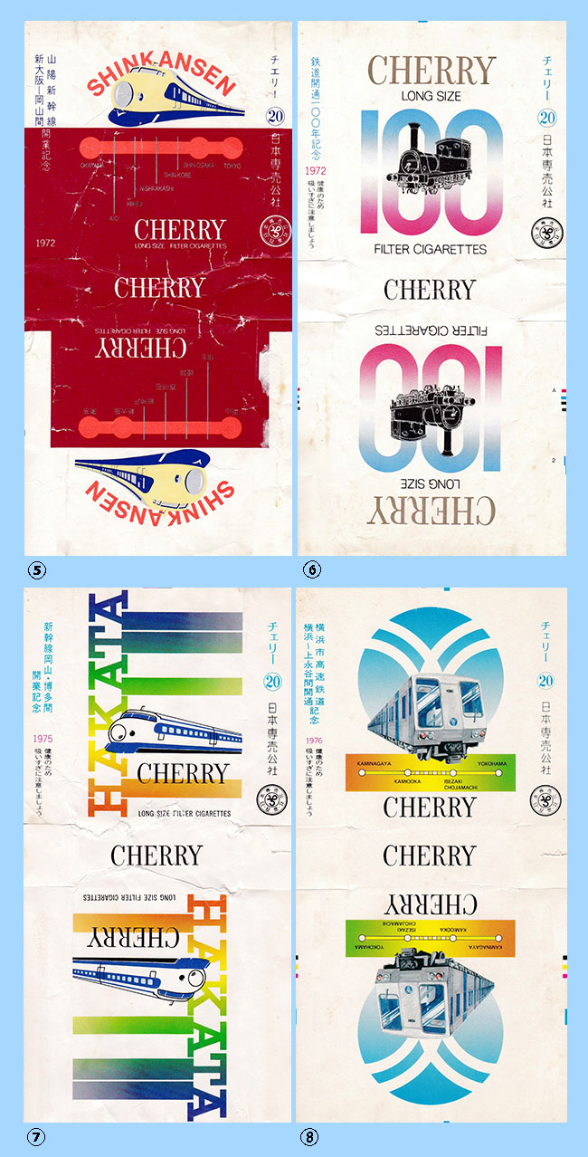 1972年は春に東海道新幹線の岡山延伸。秋には鉄道100周年で記念たばこが発売された。銘柄はピースではなくチェリーだった。たばこのことはよくわからないが、その当時はチェリーが人気だったのだろう。山陽新幹線新大阪~岡山間開通記念⑤はしわだらけになってしまったが、知人が捨てようとしていたのをもらい受けたものだ。3月15日が開業日だった。同じ年の秋、10月14日の鉄道記念日には鉄道開通100年記念⑥が発売され図柄は開業当初の1号機関車で、銘柄はやはりチェリーだった。このパッケージから健康のため吸いすぎに注意しましょうという文字が印刷されている。