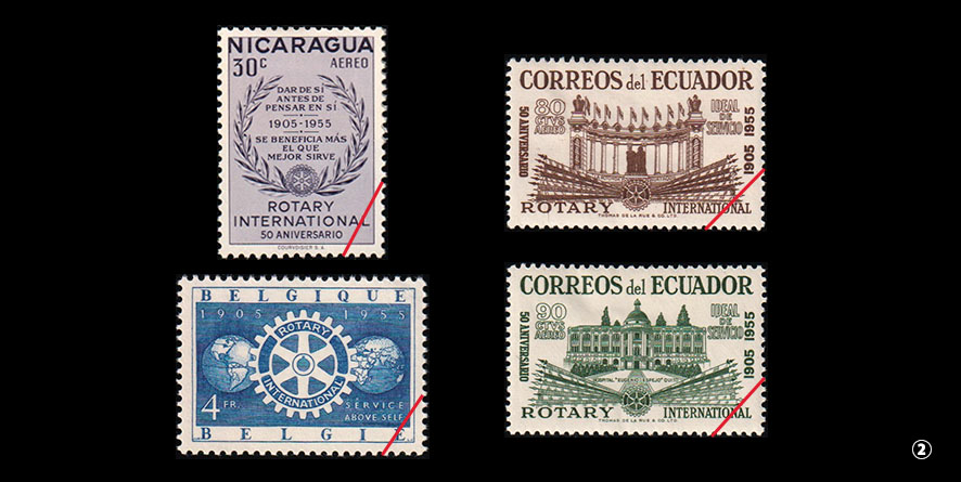 RIから各国のRCに送られた切手の見本図案は、ほとんど残っていないようですが、RIの公式親睦グループのひとつであるROTARY ON STAMPS(ROS)が当時RIから受領した数セットが現存し、そのうちの1セットが私の手元にあります①。カラーで公開できず残念なのですが、青と茶系の2色で刷られ、裏糊もついていますが目打ちはありません。裏糊があるのでシミが出てきており、今後の保存をどうするかが課題です。