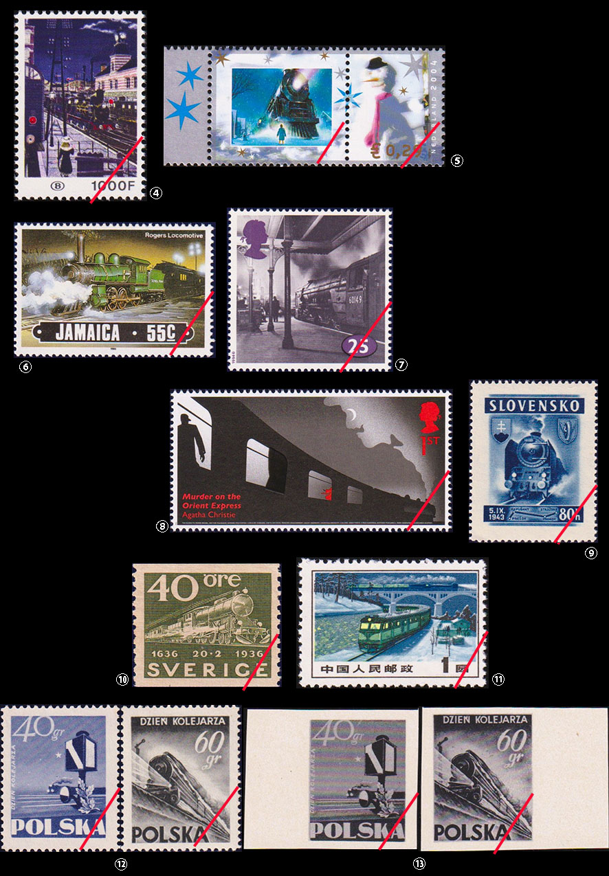 切手の世界でも夜汽車を描いたものはそう多くない。日本には数年前に「日本の夜景シリーズ」なる切手が発行されたが、夜汽車の切手はいまだにない。ベルギーの切手にはデルボーが描いたオーステンド港駅の夜汽車④がある。この切手はベルギーの鉄道150周年記念小型シートにも採用されている。オランダの昨年のクリスマス切手⑤には夜汽車が登場した。アメリカの夜汽車は少ないが、ジャマイカが1920年代の夜汽車⑥の切手を発行している。鉄道発祥の地の英国では、ロンドン・キングスクロス駅で発車を待つ夜汽車の姿⑦が描かれている。列車はエジンバラへ直行する「フライングスコッツマン」、機関車はA3型と思われる。