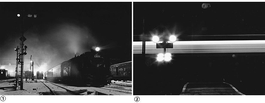 夜汽車というのはそれが蒸機列車から、電機、電車と変わっても、また、行楽であれ出張であれ、楽しい旅の形のひとつだった。そんな夜汽車を写真に撮りたいと、あちこちで試みたがなかなか難しいことだった。ある深夜、C62が牽く特急「ゆうづる」の走行写真を駅のホームの明るいところで流し撮りなら写せるのではないかと試みたが、ダメだった。というわけで、写真①は網走で発車待ちのキューロクがひく旅客列車。でもこの列車は夜汽車ではあるが、日をまたいで走らないので夜行列車とは言えないかもしれない。走行中を撮るには、列車が何かわからなくなるが、窓の光の流れを写そうと、ある幹線の、人も車も来ないような踏切を探して長時間露光で撮ったのが②。