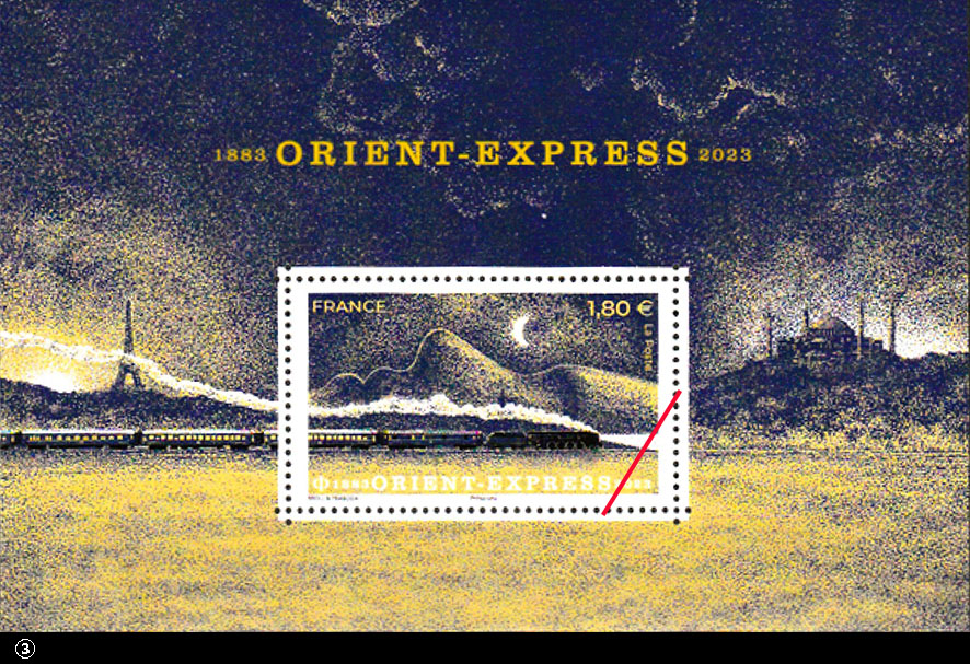 たまには夜汽車の思い出をふりかえろうと思ったが、写真は他にない。何か・・・そうだ私の鉄道切手コレクションに、素晴らしい夜汽車の切手があったぞ、と、探し出してみた。それが③。フランスが2年半前、オリエント急行(パリ~イスタンブール)運転開始150周年の記念に発行した、小型シートタイプの切手だ。三日月に照らされた野を蒸気機関車の牽くオリエント急行が走っている。フランスのパリからトルコのイスタンブールに向かっている。エッフェル塔とアヤソフィアがそれを示している。