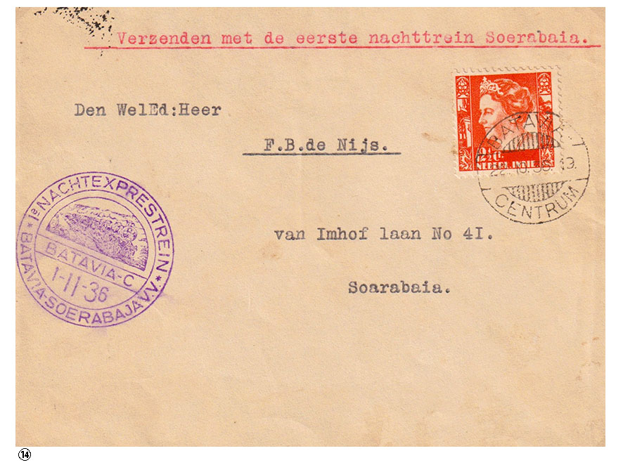 最後に実逓カバーを1枚⑭。上方に「夜行列車スーラバインで送る」と、赤字で書かれている。左下のゴム印には「バタビア~スラバヤジャワの夜行急行列車」の文字がある。1936年当時のオランダ領インド(現・インドネシア)でバタビア(現・ジャカルタ)からの夜行急行一番列車の郵便車に積み込まれた手紙であろう。